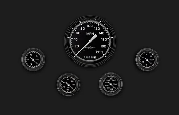 AutoCross Gray five gauge set, with standard matte-black low step bezels and flat glass lenses. See available bezel, lens, and pointer upgrades in the appropriate drop-down menus.