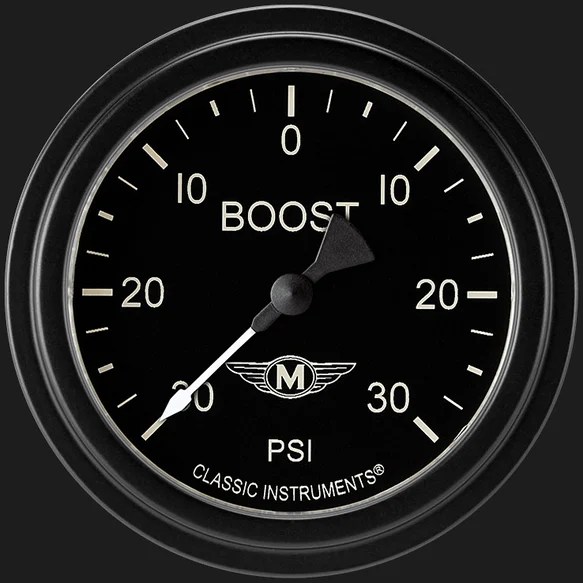 Moal Bomber;2 5/8″ Full sweep Boost/Vacuum gauge, with standard matte black;low step bezel and flat glass lens. See available bezel, lens, and pointer upgrades in the appropriate drop-down menus.